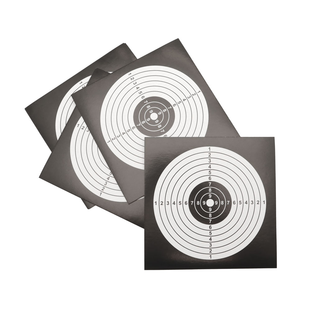 Måltavlorna har 10-ringar och svart bakgrund för en bättre kontrast. Tavlorna är gjorda i lite tjockare material som gör att de sitter på plats bra i kulfånget. Tavlornas storlek är 14×14 cm och passar i alla standard kulfång för luftvapen.